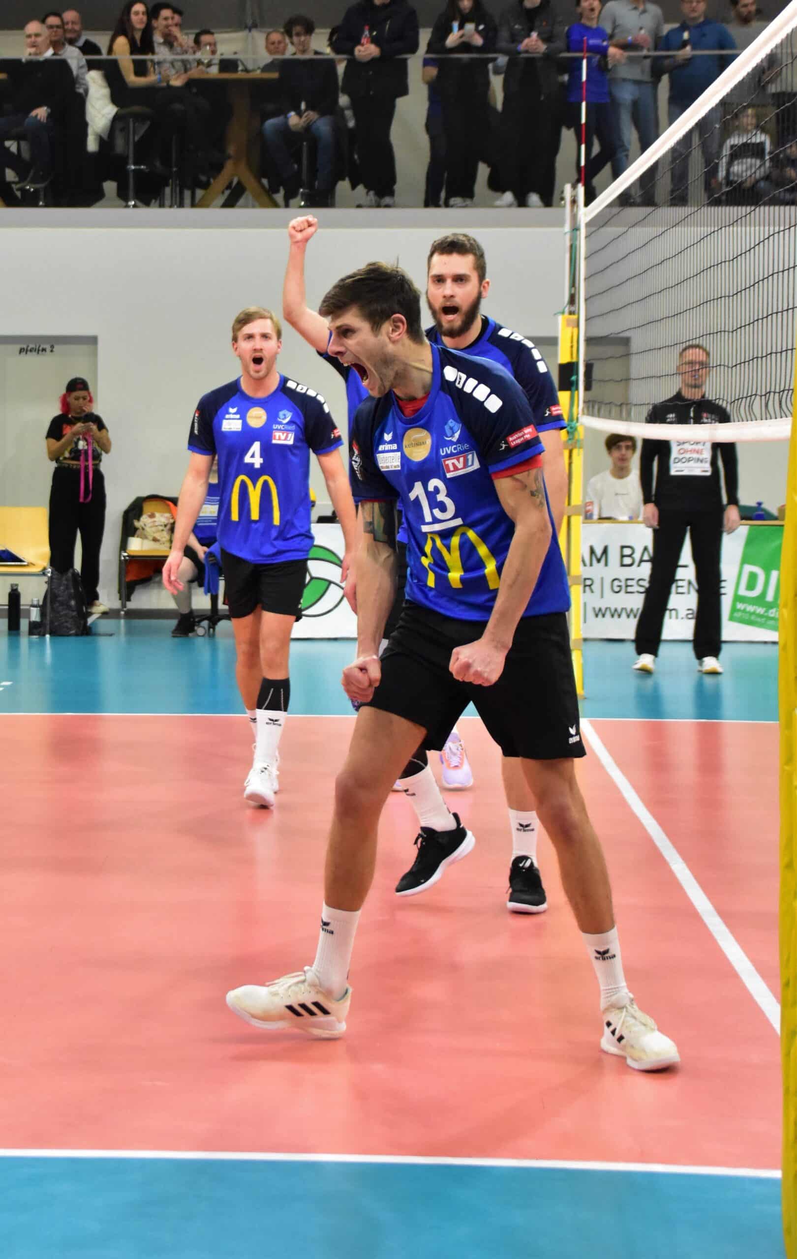 Beim heutigen (12.02.) Auswärtsspiel in Graz konnte der UVC McDonald’s Ried drei wichtige Tabellenpunkte sammeln. „Obwohl einige Spieler verletzungs- und krankheitsbedingt ausgefallen sind, und wir es somit etwas schwieriger hatten, hat das Team super gespielt.“, kommentiert Libero Lauris Ochaya das Spiel „Außerdem freut es mich natürlich, dass ich gegen meinen Bruder Liam gewonnen habe und mich für die Niederlage im Herbst revanchieren konnte.“